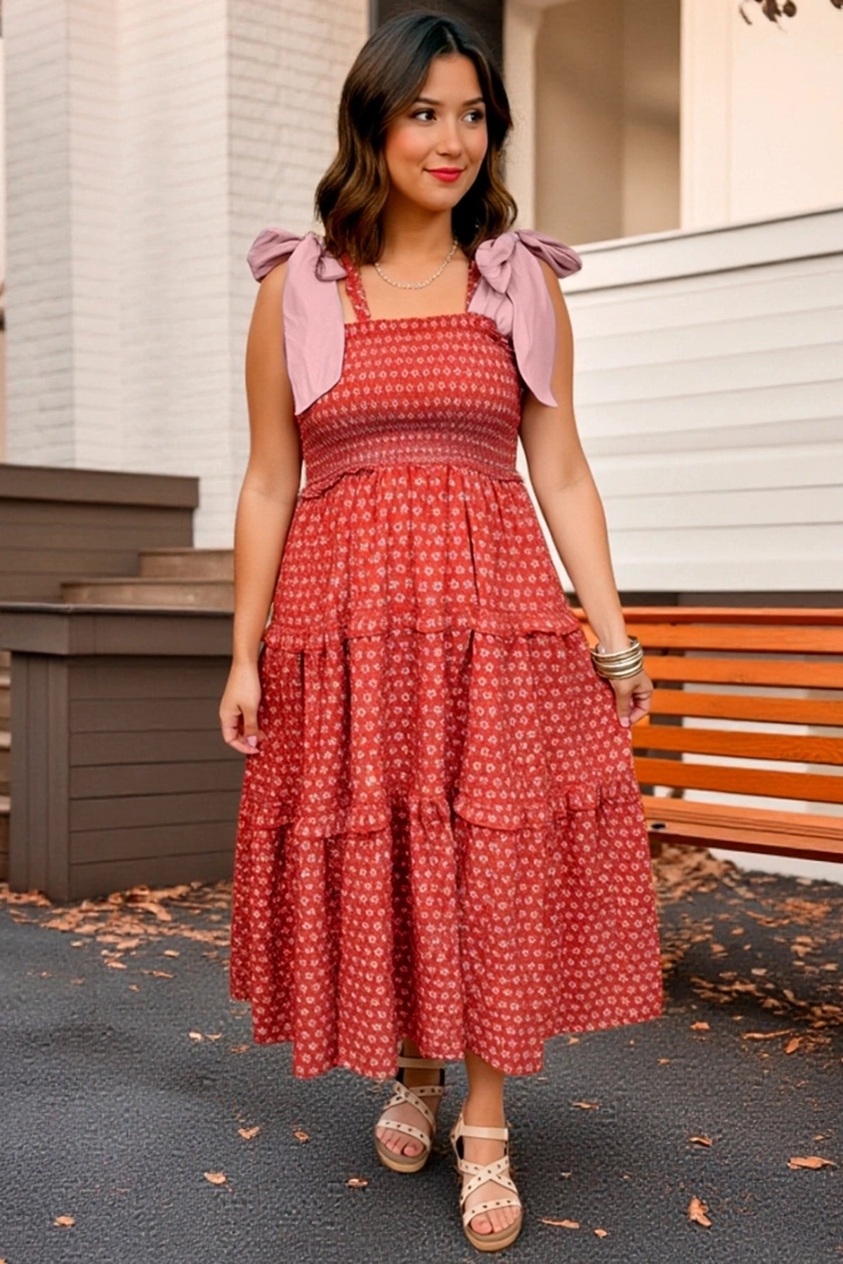 Wenrine Womens Red Smocked Tie Shoulder Maxi Dress