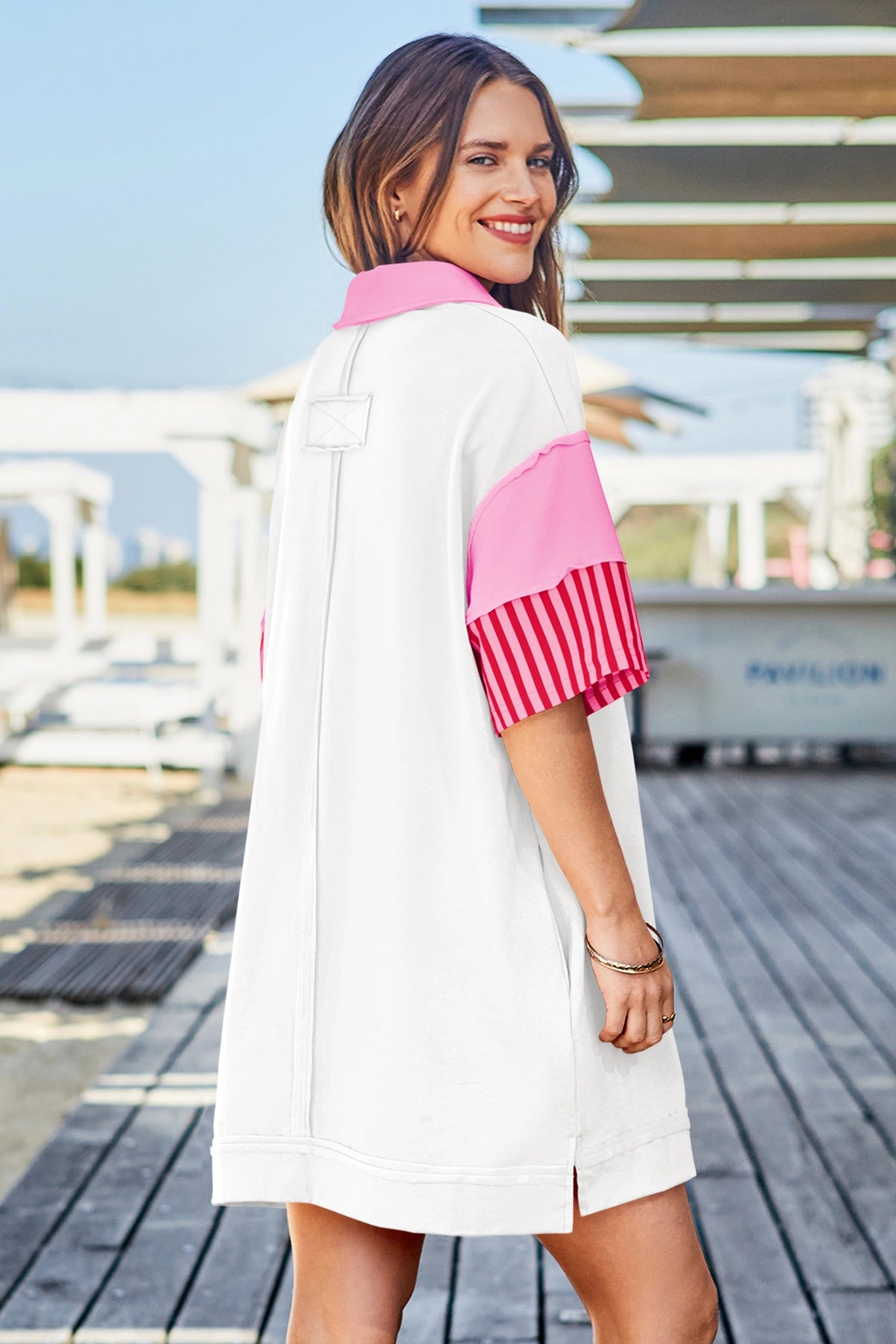 Wenrine Women's White Color Block Polo Sweatshirt Dress
